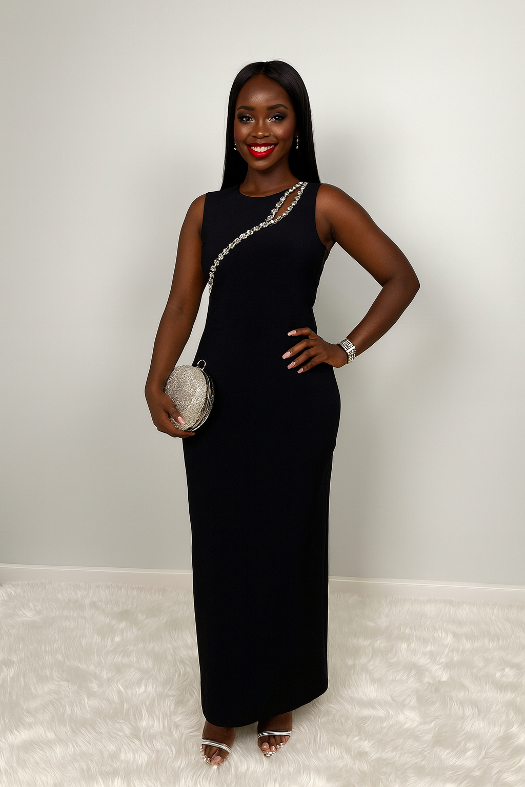 Succombez au charme de cette robe noire longue au design raffiné et sensuel, cintrée tout le long du corps pour sublimer la silhouette. Son ouverture ornée de diamants au niveau du torse révèle subtilement la peau, ajoutant une touche de glamour sophistiquée.
